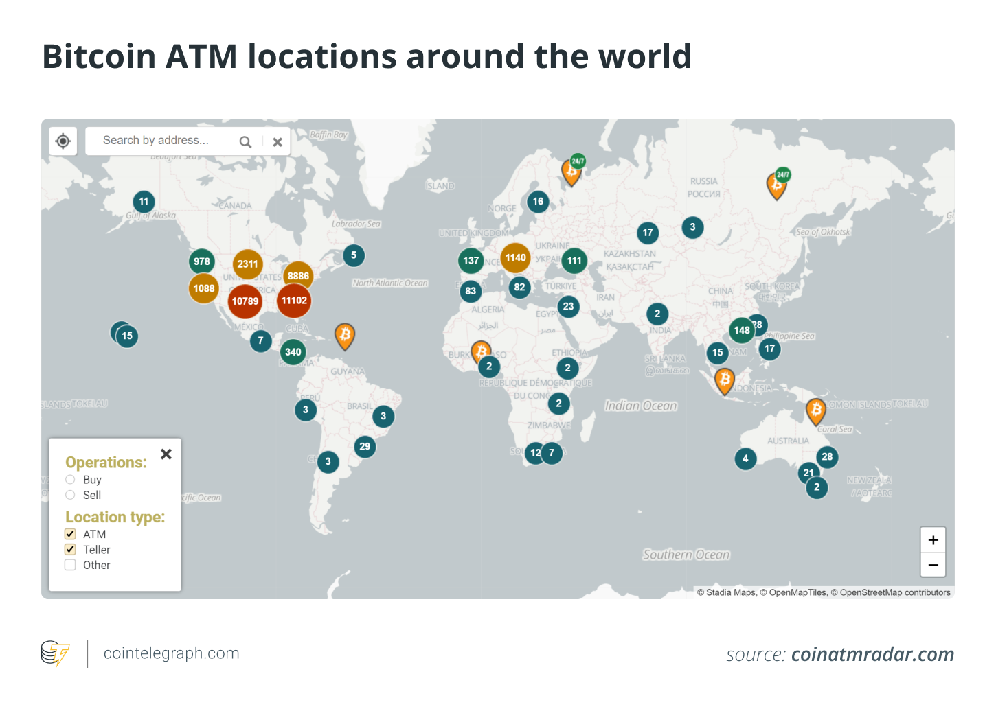 比特币ATM机还不像普通的ATM机那么普遍,所以你可能不容易找到,特别是如果你住在大城市。你必须使用实时地图,如比特币ATM地图或比特币ATM雷达,以找到离你最近的比特币ATM机的位置。除了位置,这些地图还允许你根据运营商收费、机器类型和支持的加密货币过滤搜索。