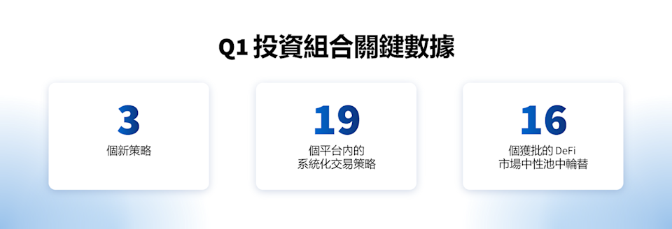 在 2022 年第一季,投资组合被分配到三个新的策略,让 Yield App 平台上的系统交易策略总数达到 19 个。此外,在 2022 年第一季,我们在 16 个经批准的 DeFi 市场中立池中转换了仓位,并增加了对两个现有系统性交易策略的配置。