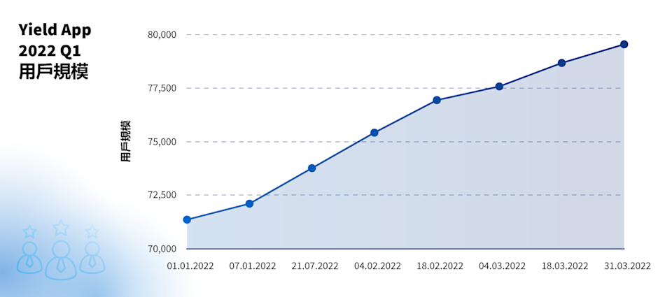 今年的前三个月中,Yield App 的用户数进一步成长,这一季有 8,200 名新用户註册了 Yield App 平台。截至 2022 年 3 月 31 日,Yield App 的用户群成长到 79,556 名客户,和 2021 年 12 月底的 71,356 名相比,成长了 11.5%。