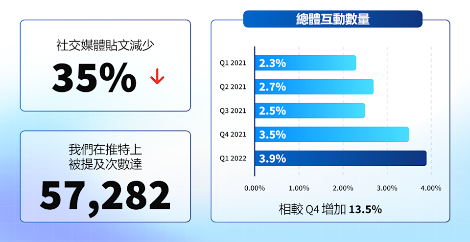 在 2022 年第一季,Yield App 的社群媒体策略的重点从「数量」 坚定地转向「质量」 ,因为我们正在努力建立一个灵活、长期的 Yielders 社群。因此本季,我们在社群媒体渠道上发布的贴文减少了 35%,倾向于有洞察力和教育性的内容,而不是短期的头条新闻。