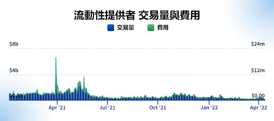 2022 年第一季对于更广泛的 DeFi 市场而言是一个别具挑𢧐的时期,整个第一季的交易量比去年同期大幅减少。下图呈现了 2021 年第一季和 2022 年第一季之间的 Uniswap 流动性提供者产生的的相对交易量和手续费。