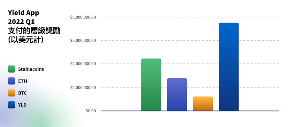 基于 Yield App 的收益结构和层级奖励计划,用户的部分收益以 YLD 代币支付。在 2022 年第一季,Yield App 很高兴地向各位报告,所有用户共获得 11,555,972 YLD 的支付奖励。