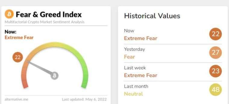 比特币恐惧与贪婪指数由昨天的 27,又跌至 22,重回「极度恐惧」领域。