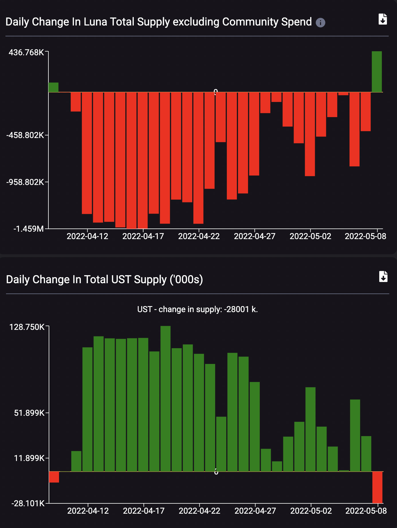 下图显示了每日UST供应量持续下降的趋势,同时每日LUNA供应量相对增加。5 月 8 日,UST 的市场出现两个月来的首次收缩,跌至负 2810 万。同时,LUNA 的供应量增加了超过 4.3675 亿。