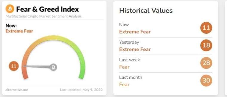反映投资人情绪的比特币恐惧与贪婪指数,今天更已低至极度恐惧的 11,较昨天的 18 快速下滑。