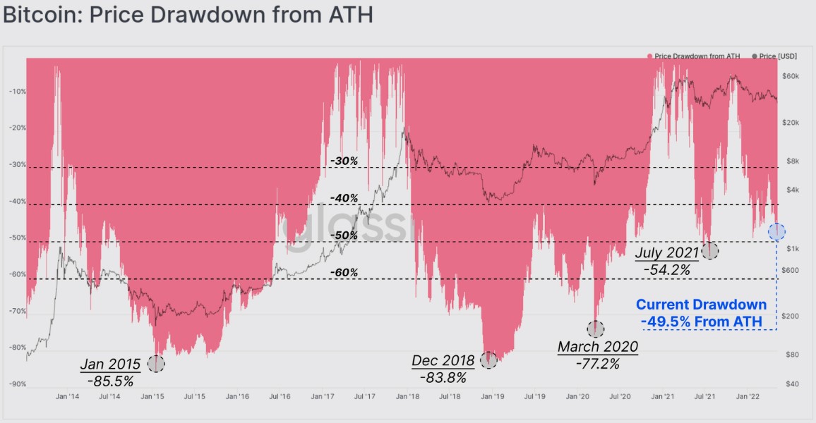目前,BTC 价格从 11 月的历史高点下跌了 50%,链上分析公司 Glassnode 在最近的一份报告中指出,这种下跌“与之前比特币熊市的最终低点相比,仍然是温和的”。