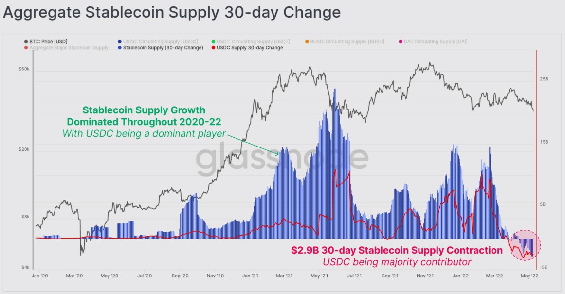 从稳定币供应量来看,可以发现避险情绪上升的额外证据。自2020年3月市场抛售以来,稳定币供应量从53.3亿美元增加到1582.5亿美元,但在过去两个月出现下降。