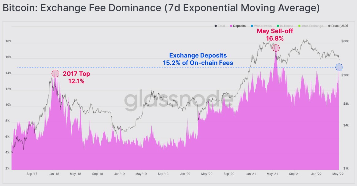 这种投降的证据可以从比特币交易费用的主导地位中找到,它衡量了比特币网络上支付了多少百分比的费用来将 BTC 存入交易所。