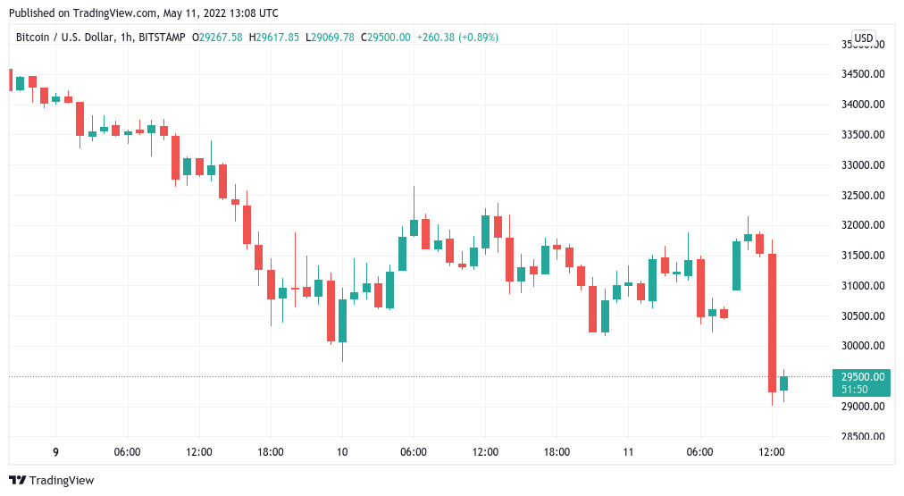 Cointelegraph Markets Pro 和 TradingView 的数据显示,随着消费者价格指数 (CPI) 数据的发布,BTC/USD 从 31,500 美元跌至 30,000 美元的支撑位。
