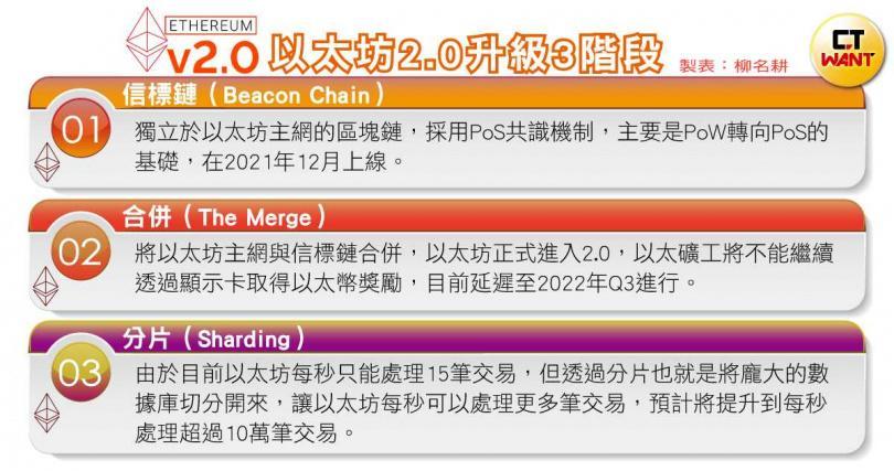 而升级的前置作业,在2021年8月以太坊「伦敦升级」硬分叉时展𫔭,除了针对手续费、矿工分润进行调整外,PoW转为PoS的衔接轨道「信标链」(Beacon Chain)在同年12月上缐,使以太币持有者可以将以太币进行质押,好让以太坊未来有更广泛的商业应用模式。