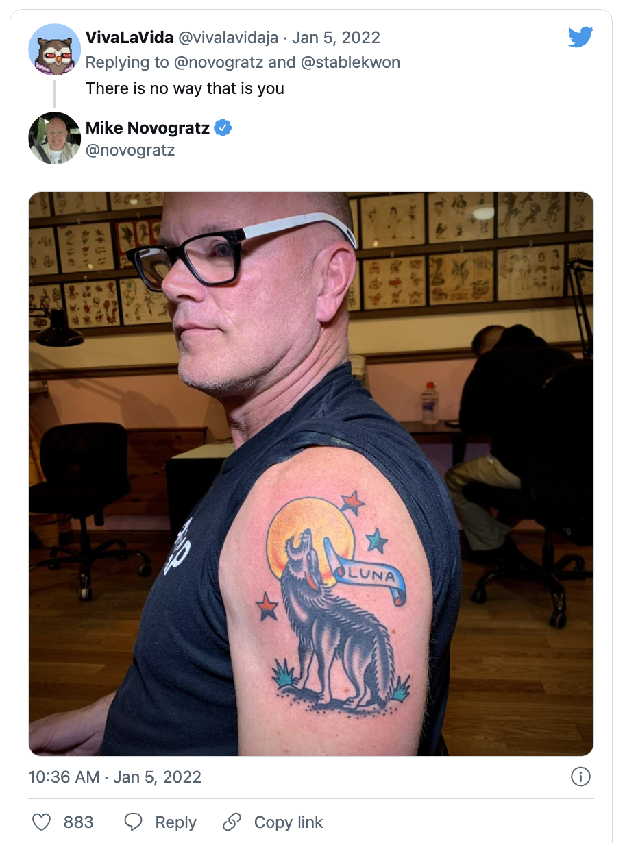 今年1月5日,诺沃格拉茨首次向他的46.1万推特粉丝展示了他的狼主题纹身,当时热情地展示了他对现已崩溃的Terra生态系统的支持。