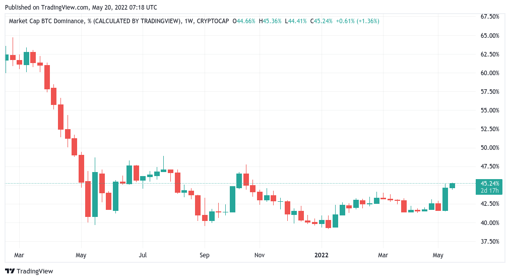 在Terra LUNA崩溃后,比特币以外的币种遇冷。现在,有迹象表明,山寨币交易可能会迅速让出主导地位。