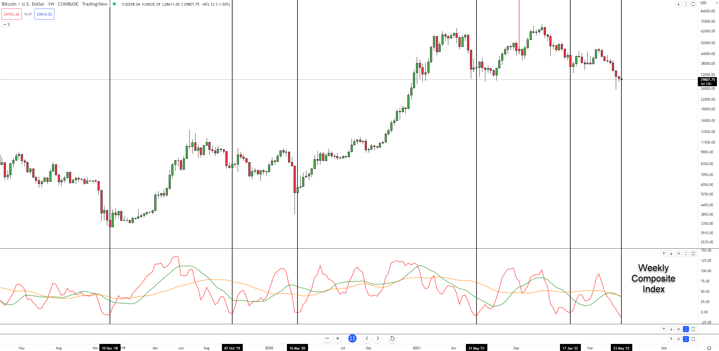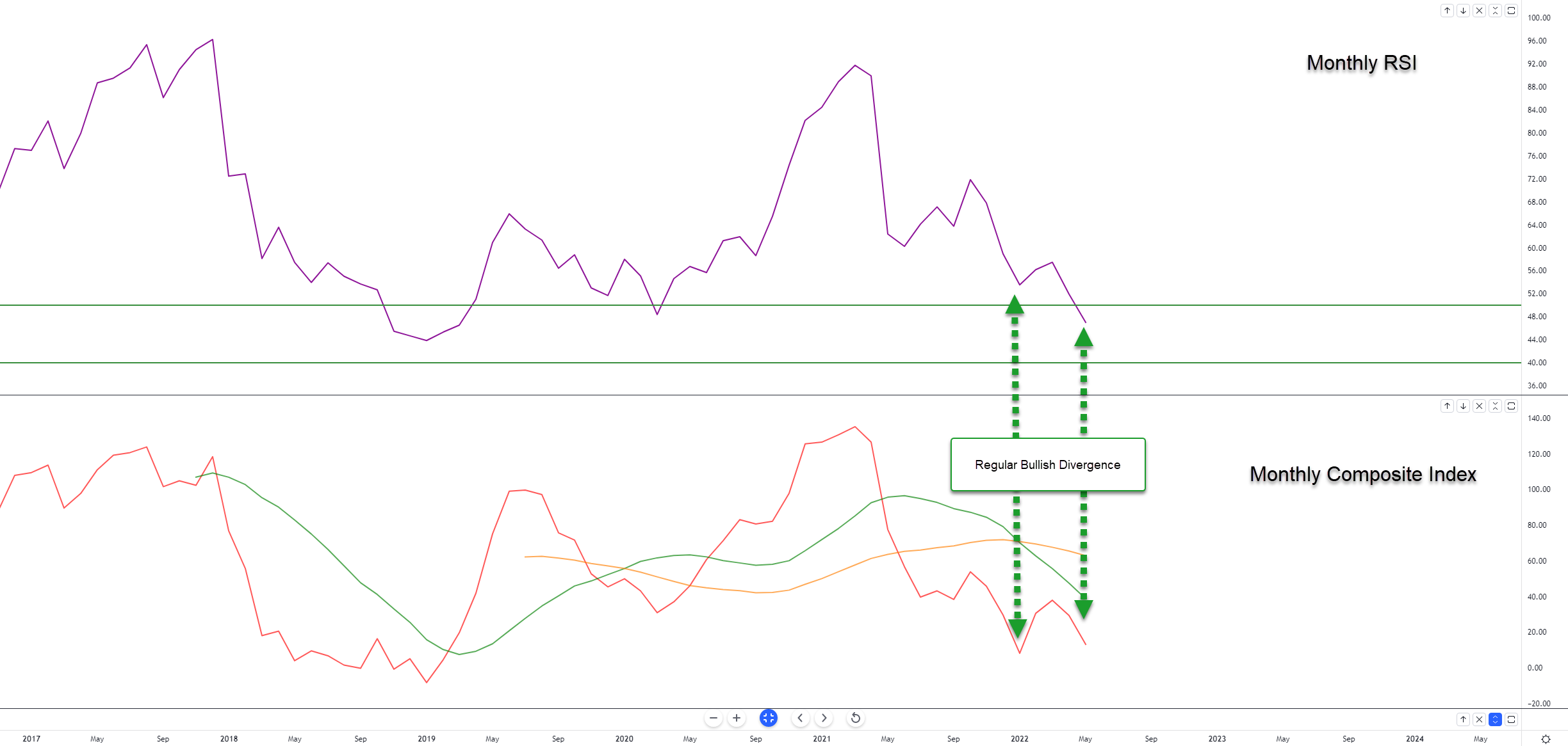 比特币振荡的另一个主要动态是月度 RSI 和月度综合指数之间的定期看涨背离。由 Connie Brown 创建的综合指数本质上是带有动量计算的 RSI——它捕捉到了 RSI 无法捕捉到的走势。