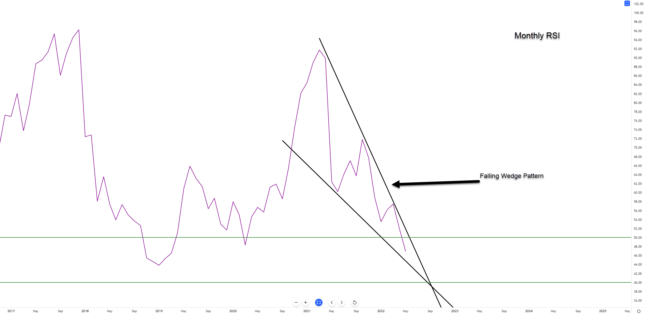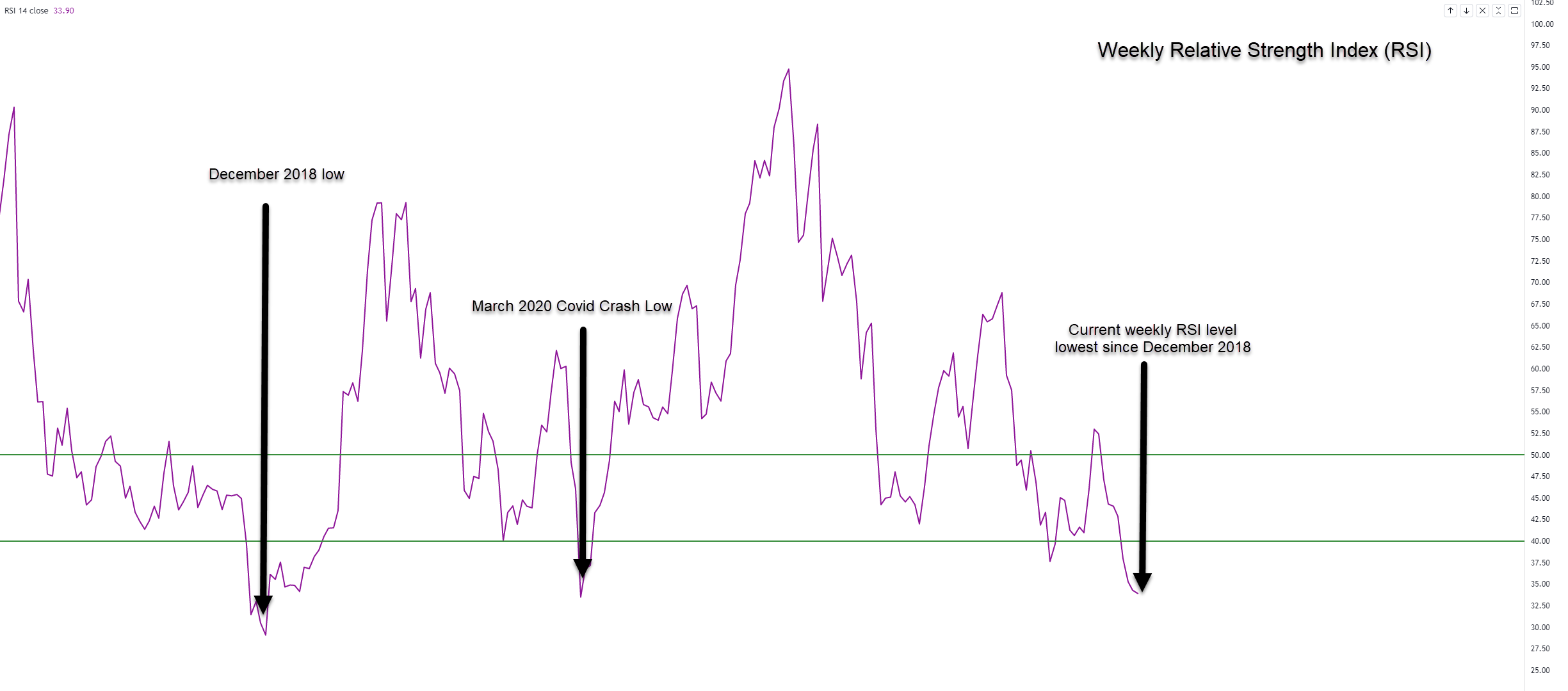 每周 RSI 仍处于看涨状态,尽管它低于 50 和 40 的超卖水平——直到达到 30,看涨RSI 仍然存在。目前,每周 RSI 水平为 33,是自 2018 年 12 月 10 日当周以来的最低水平,略低于 2020 年 3 月 COVID-19 崩盘低点 33.48。