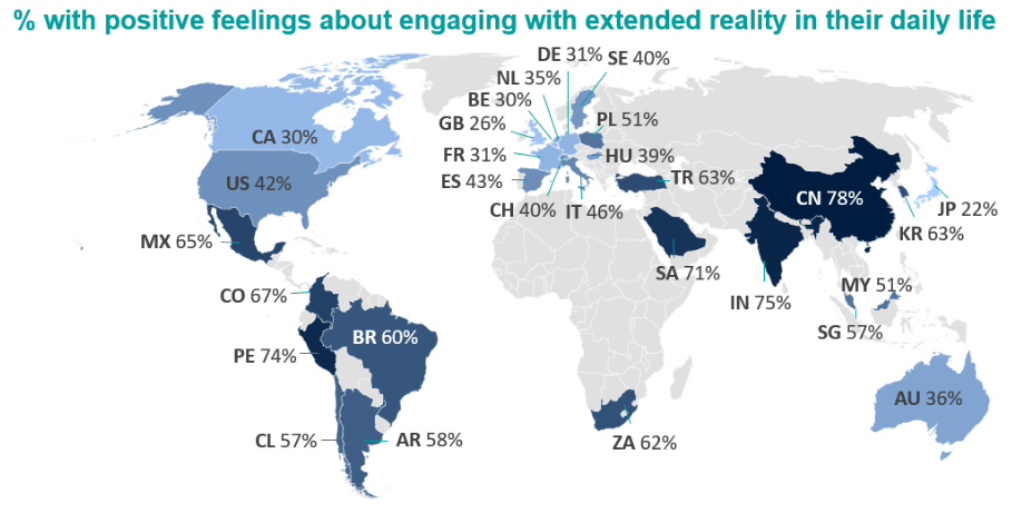 按国家划分,在日常生活中参与元宇宙的感受,深色区域表示该区域积极感受的比例较高 来源:Ipsos