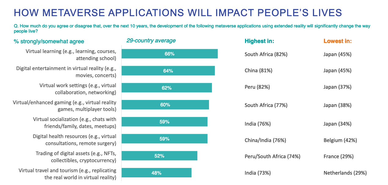 受访者还接受了关于他们认为元宇宙影响最大的生活领域的调查。南非、中国和印度等发展中国家一致认为,虚拟学习、娱乐、数字社交甚至远程手术等应用程序将对人们的生活产生影响。