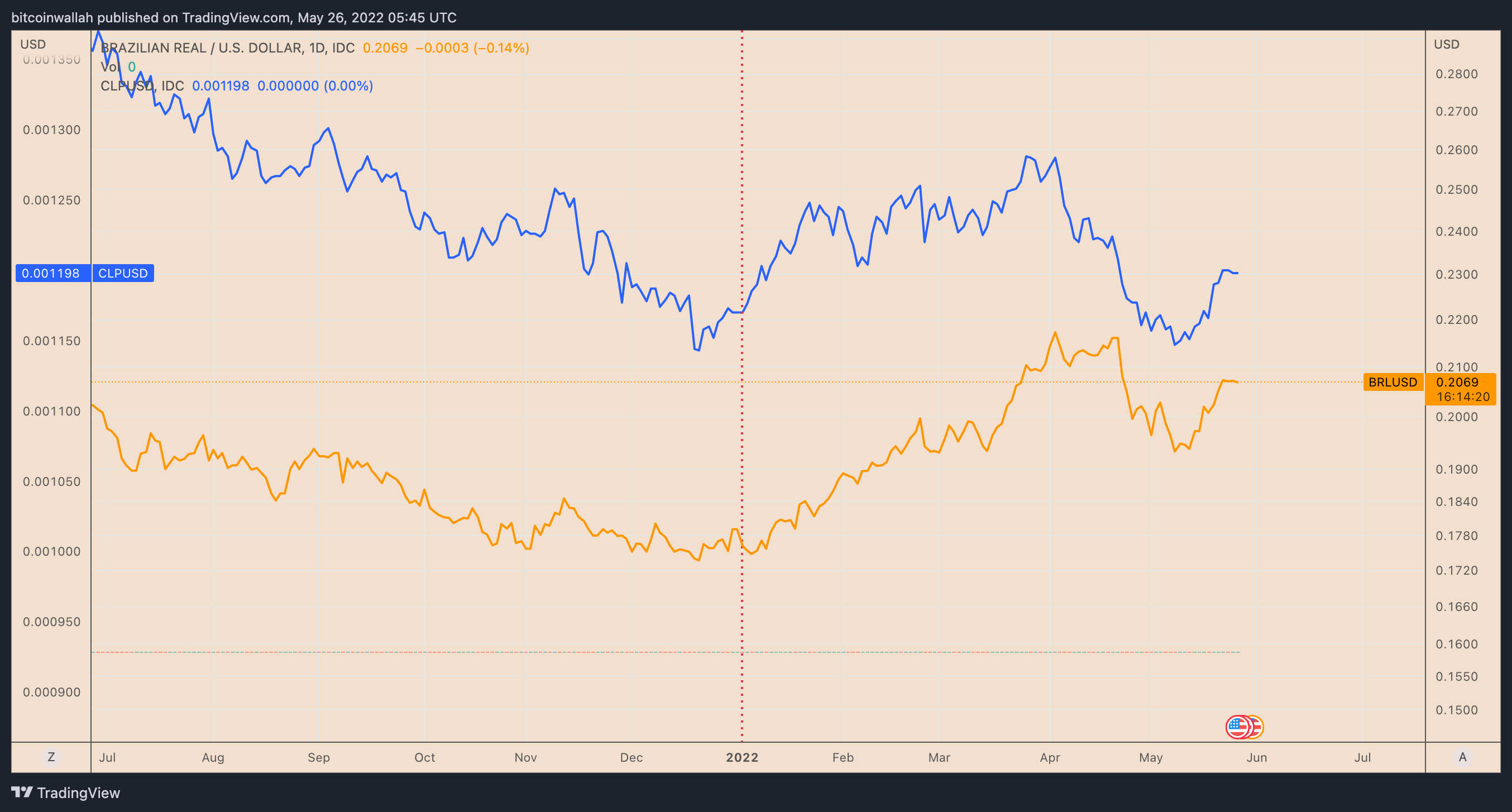BRL/USD和CLP/USD日线图 来源:TradingView
