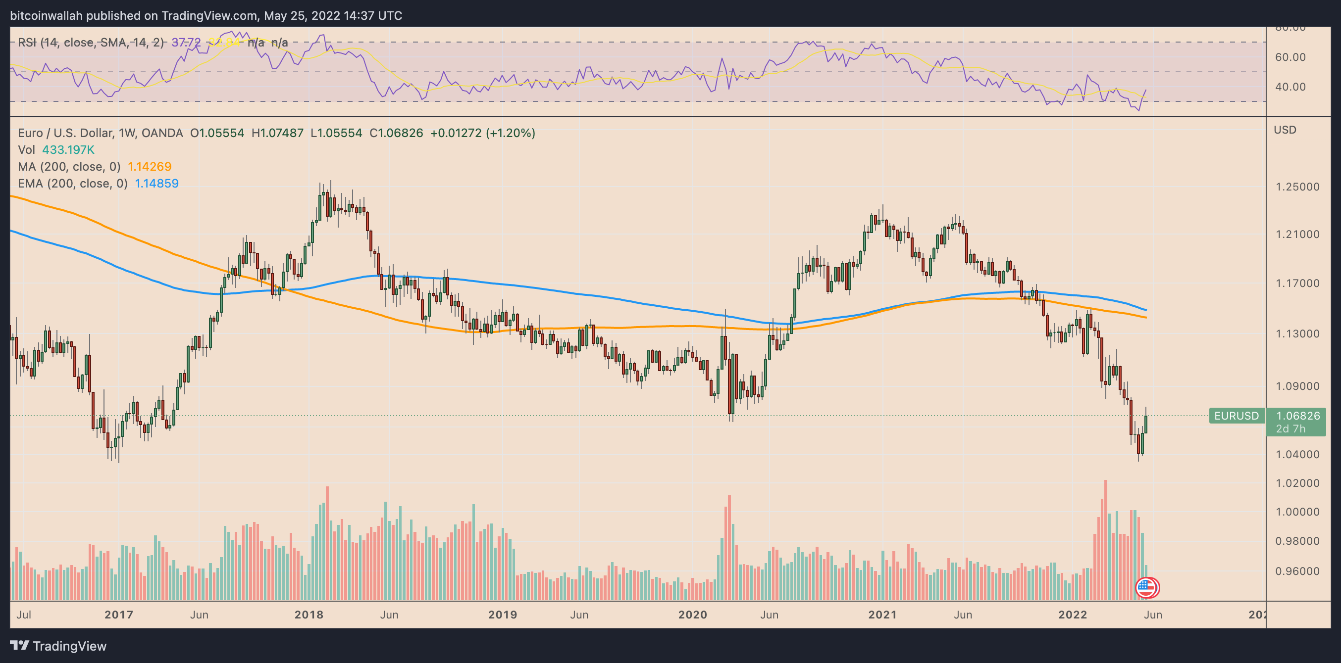 本周早些时候,随着欧洲央行(ECB)总裁Christine Lagarde在5月23日制定了一项更加鹰派的新政策,美元指数也有所回落。
