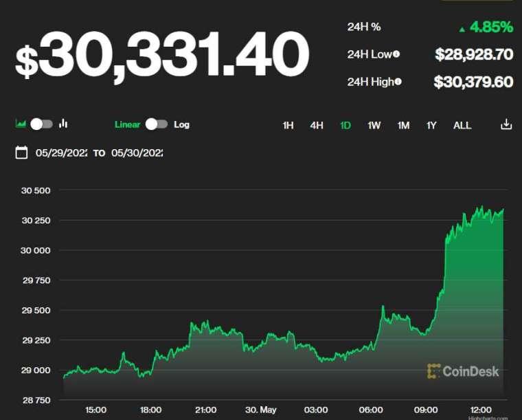 据 Coindesk 报价,至台北时间下午 13:16,比特币报 30331.40 美元,24 小时涨 4.85%,其他主要货币也普遍上扬,以太币报 1878.87 美元,24 小时涨 5.83%,币安币 (BNB)、瑞波币 (XPR)、狗狗币(DOGE) 也涨接近 5%,Cardano(ADA) 涨幅则超过 12%。