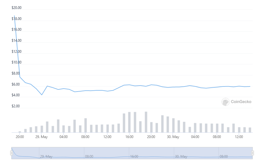 CoinGecko的数据显示,LUNA自上周六上线开盘时的18.87美元跌至撰写本文时的5.71美元左右,跌幅约为69%。