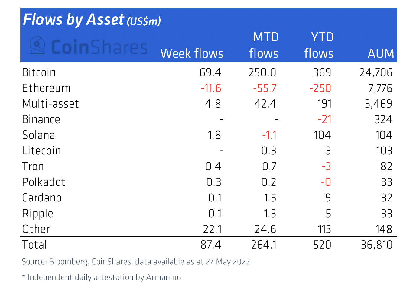 根据 CoinShares 5 月 31 日发布的每周市场报告,投资者在 2022 年从基于以太坊的投资基金中撤出了 2.5 亿美元。