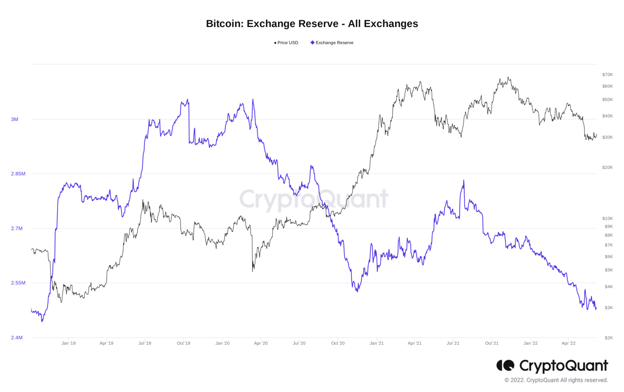 比特币交易所储备vs. BTC/USD图表 来源: CryptoQuant