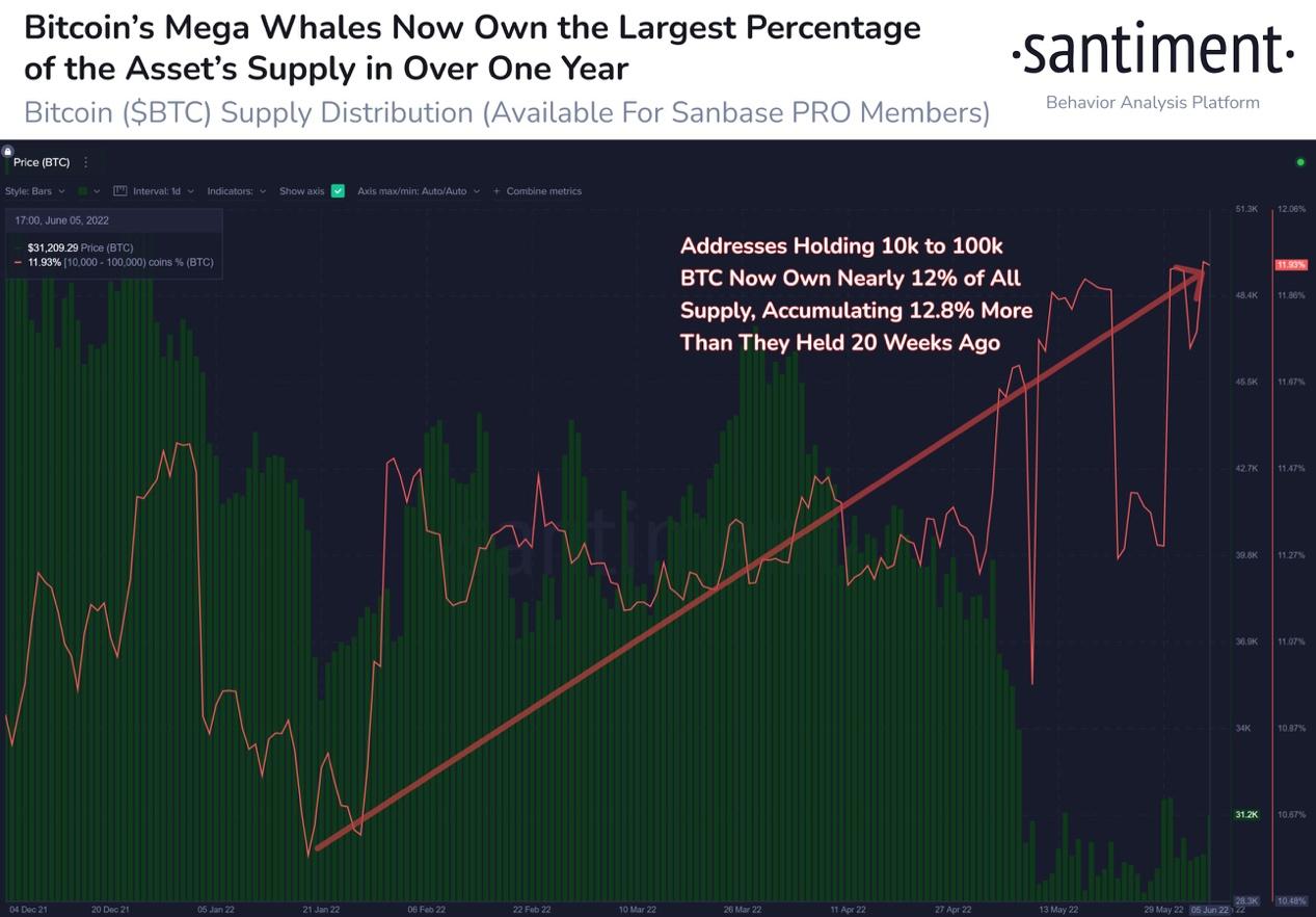 Santiment在6月6日总结说:“比特币的巨鲸地址,包括部分交易地址,拥有一年中最高的比特币供应量。”