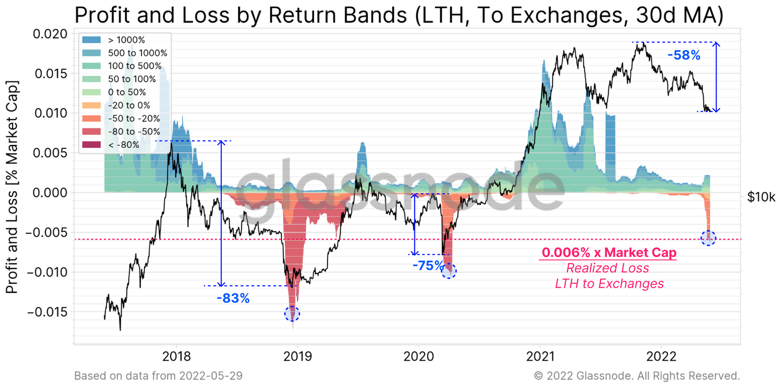 然而,如果之前熊市的历史损失模式重复的话,这种巨大的损失可能会持续一段时间。从2018年到2019年,LTH的损失达到了占市值0.015%的峰值,并且这些损失持续了大约一年的时间。Glassnode目前仅观察了一个月左右的长期投资者损失。