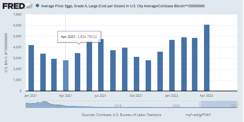 “如果我们用比特币而不是美元购买同一盒鸡蛋,图表会是什么样子?”