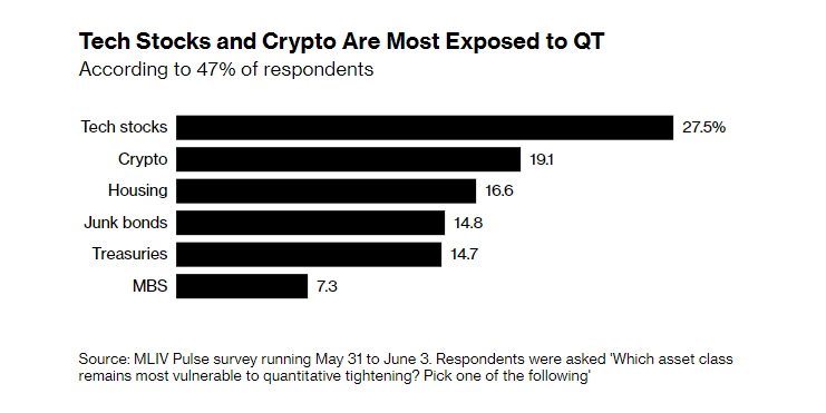 圣路易斯联邦储备银行最近发布这篇文章之际,彭博社MLIV Pulse 6月6日的一项调查显示,加密货币和科技股“非常容易”受到美国央行旨在抑制通胀的量化紧缩计划的影响。