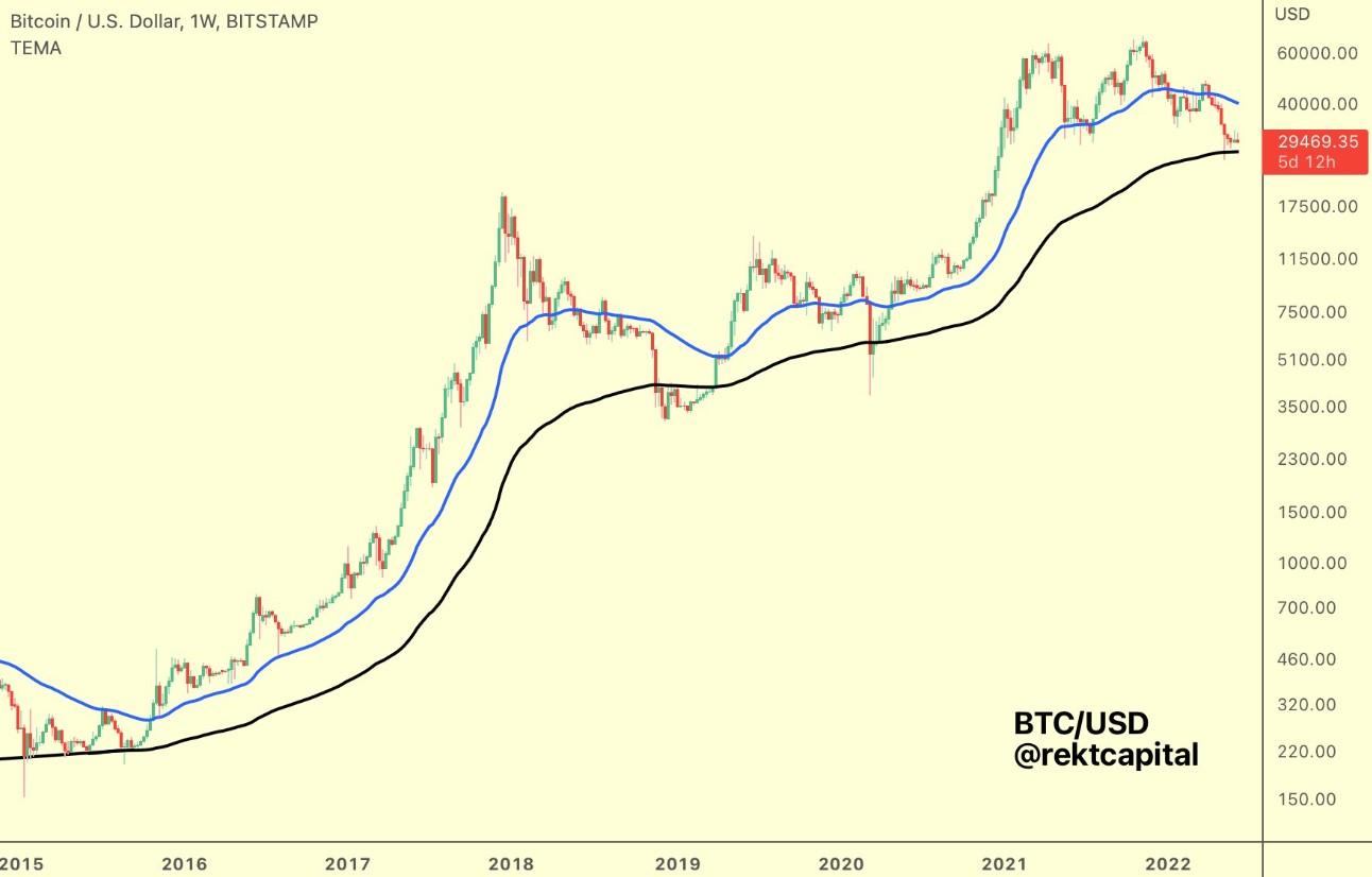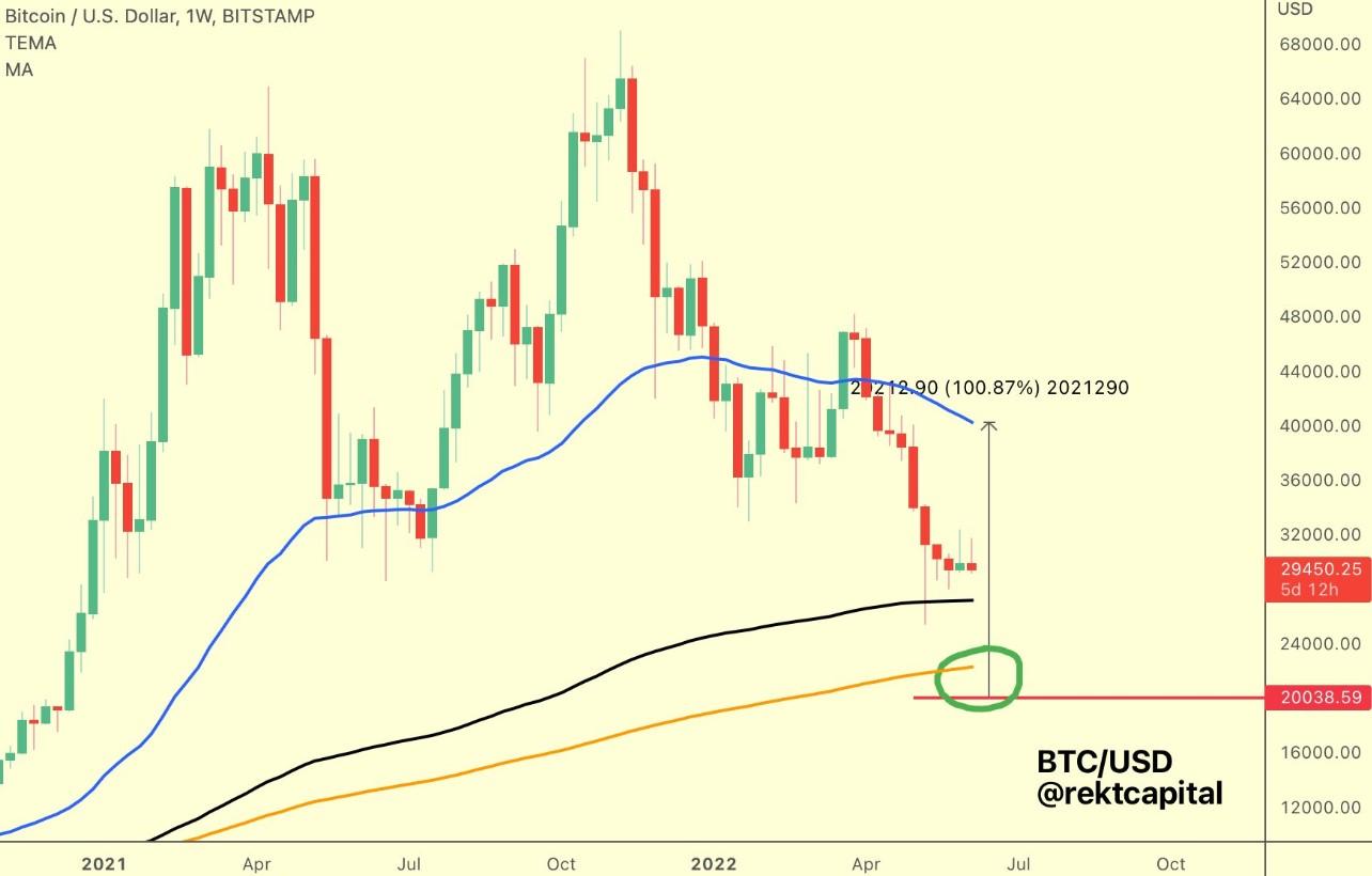 市场分析师、匿名推特用户Rekt Capital发布了下面的图表,强调了200周EMA (指数移动平均线)作为一个关键的观察指标,给想知道比特币底部的人一些参考。