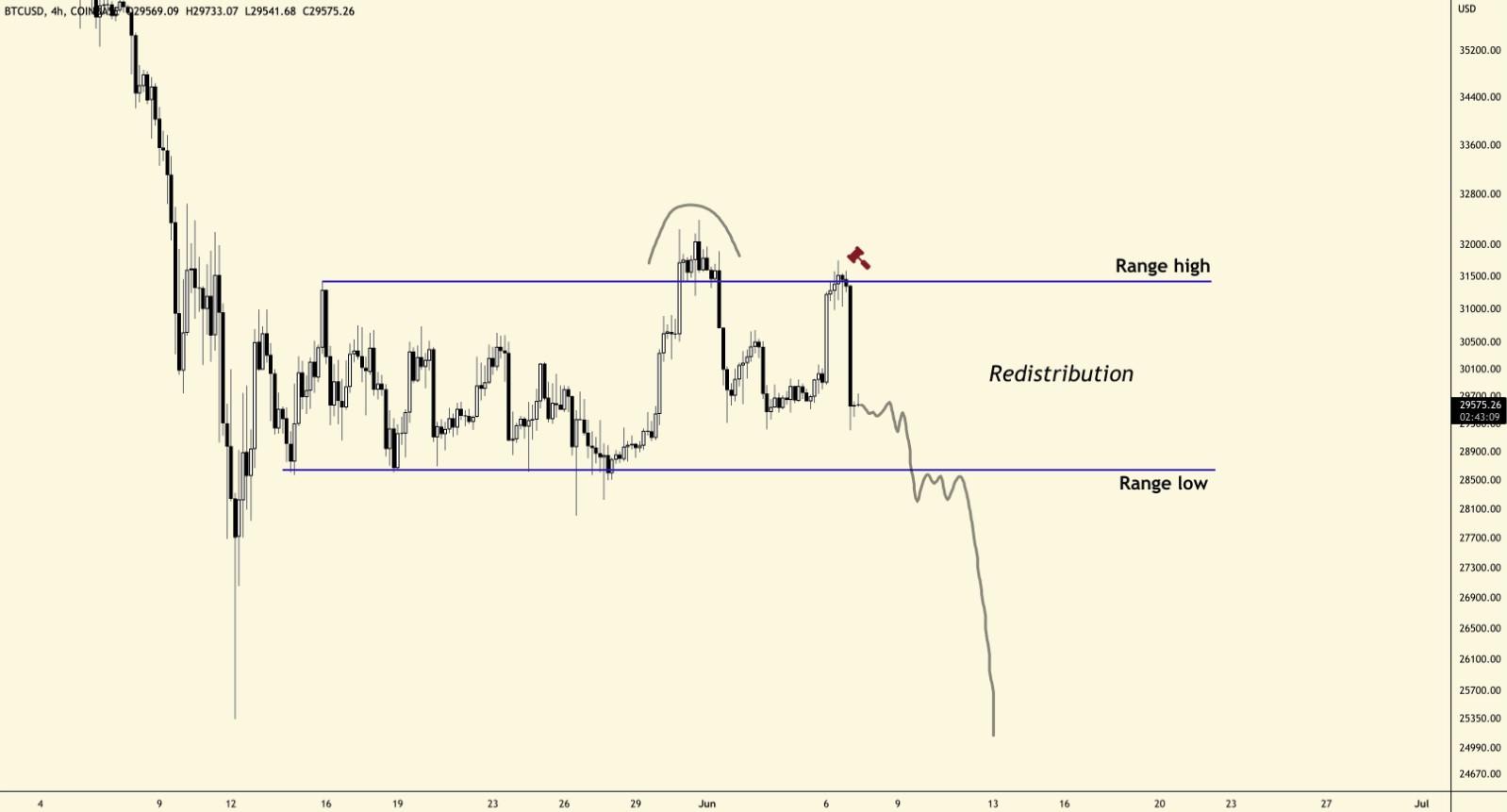 “在这个区间内发生的情况以及在这个区间高位发生的情况表明,这是一个明确的再分配区间。彻底突破低区间=确认最后一回合下跌= 21K-23K。”