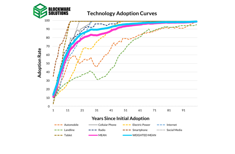 使用历史技术采用曲线的平均值和加权平均值,以及比特币采用的增长率,该报告得出了它的预测结果。