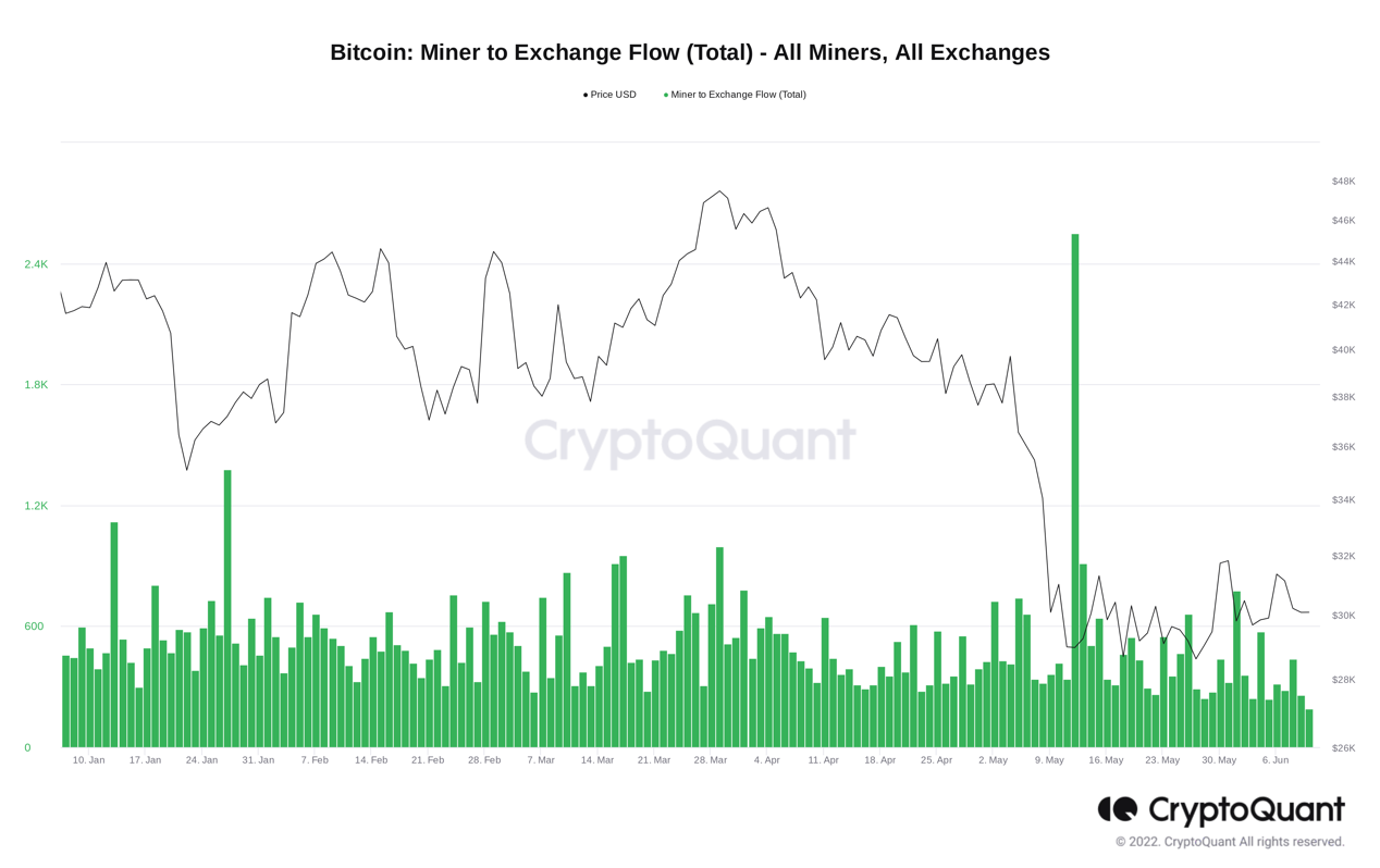 Moreno补充道,“我们的数据显示,在2022年3月期间,从矿工流向交易所的比特币不断增加,然后在5月的第一周出现了大幅飙升。这与一些挖矿公司在2022年第一季度报告的比特币抛售相符。”