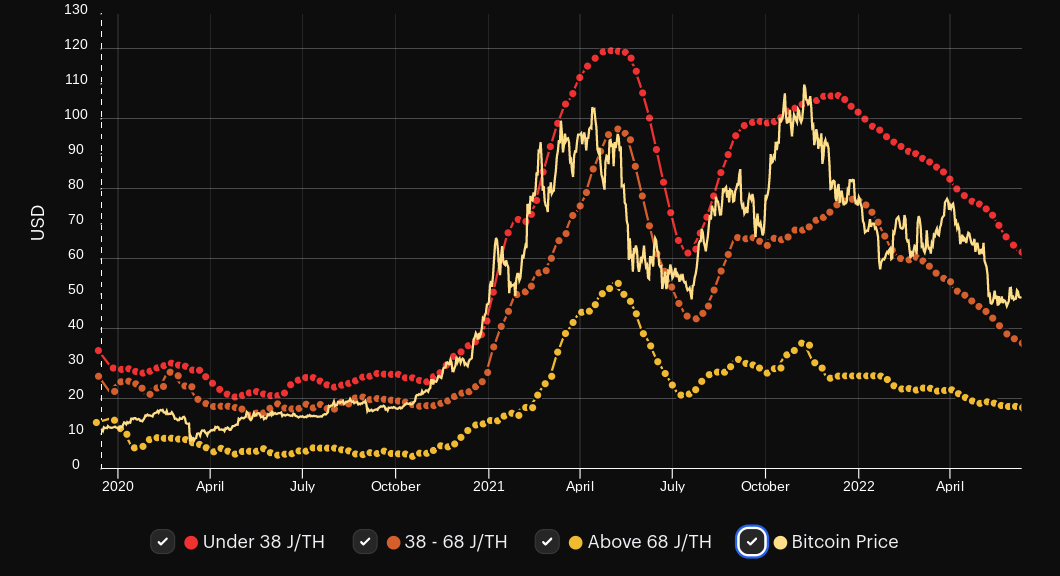 该指数根据ASIC矿机效率显示当前每terahash (TH)的USD价格,证实该成本区域自2021年12月以来一直在逐步下降。