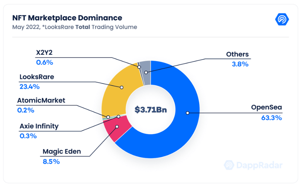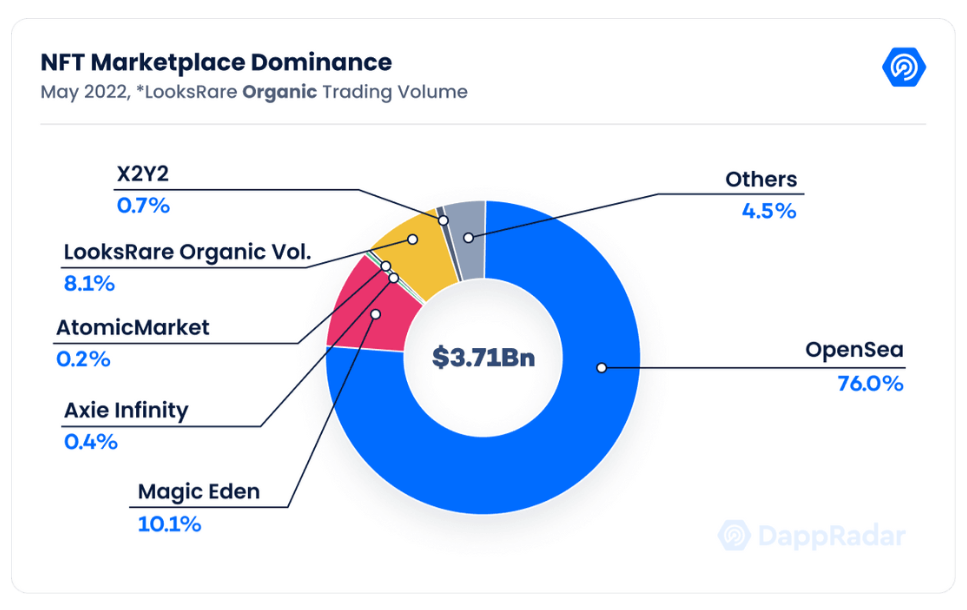 同样,NFT市场也显示出明显的发展迹象。Solana NFT系列在NFT排名中名列前茅并不罕见。LooksRare的有机交易量已经从1月份的2%增长到了5月份的35%。NFT聚合器的受欢迎程度已经达到顶峰,而领先的NFT市场OpenSea也在不断发展。