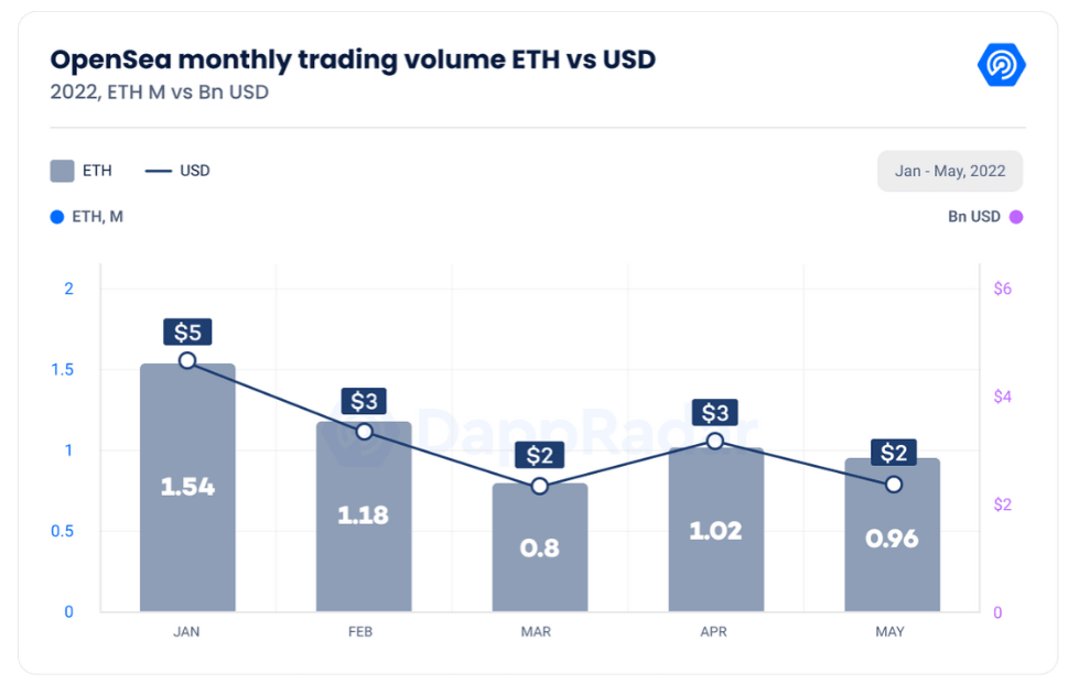 例如,行业中最大的NFT市场OpenSea在5月份的交易量为95万ETH,较4月份仅减少6.5%。由于ETH价格的变化对指标有加权影响,美元交易量呈现出不同的视角。以美元计算的OpenSea交易量比上月减少25%。两种视角的比较结果显示,以美元和ETH计价的交易量之间存在18.5%的差异。