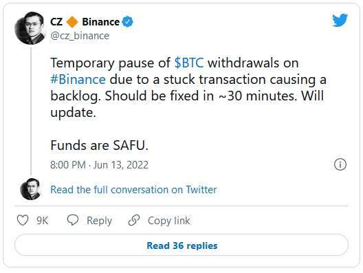 继Celsius暂停提款后 币安宣布暂停比特币提款
