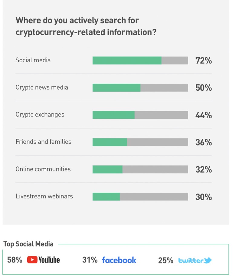 在解释南非人如何获取他们选择投资的加密项目相关信息时,研究结果显示,近四分之三(72%)的受访者通过社交媒体获取这些信息。除社交媒体外,网红和媒体名人是加密货币推广领域的主要意见领袖。