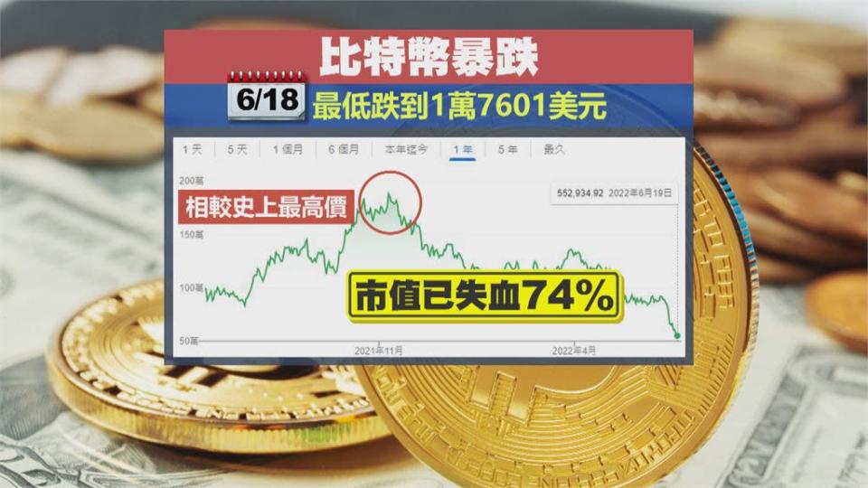 不仅油价走跌,加密货币更是腰斩再腰斩,比特币6月18日最低跌到1万7601美元,相较去年11月的六万多美元的史上新高价,市值已蒸发74%,带动整个加密货币市场蒸发约2兆美元。