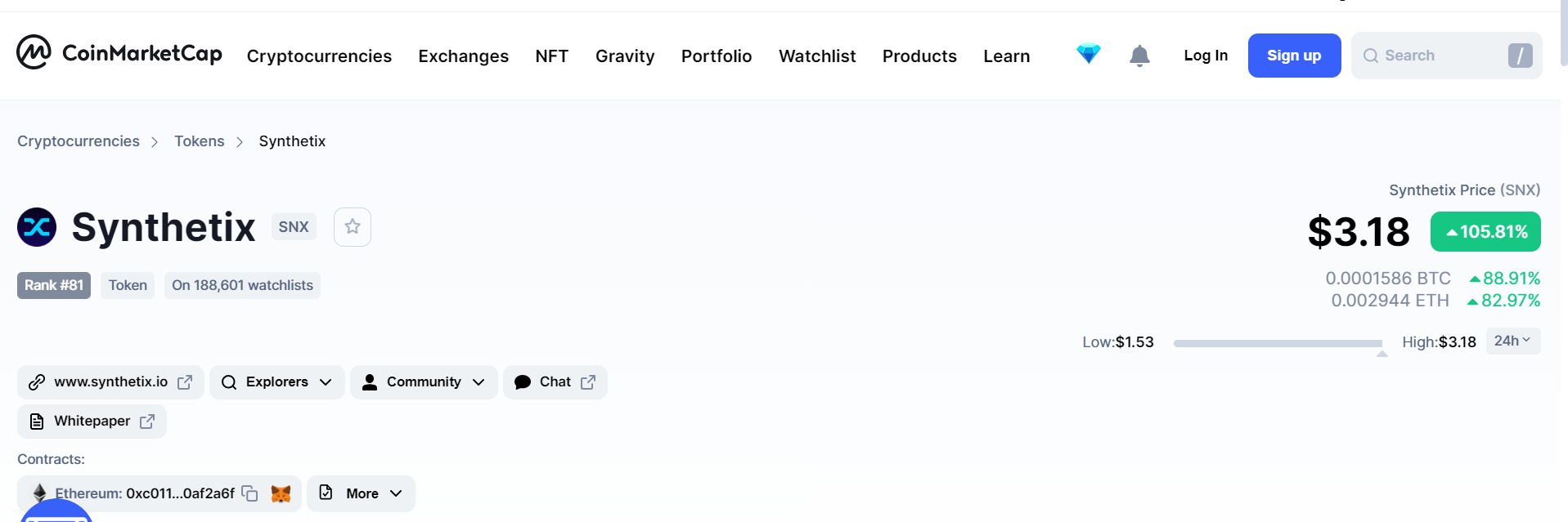 大规模交易量的直接结果是,根据CoinMarketCap的数据,SNX代币也见证了105%的短暂飙升,使其价值超过3美元。
