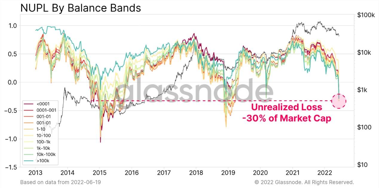 “如果我们评估损失,我们可以看到,几乎所有钱包群体,从小虾米到鲸鱼,现在持有大量未实现亏损,比2020年3月更糟,”研究人员在一份图表中指出。该图表显示了比特币持有相对于成本基础下降了多少。
