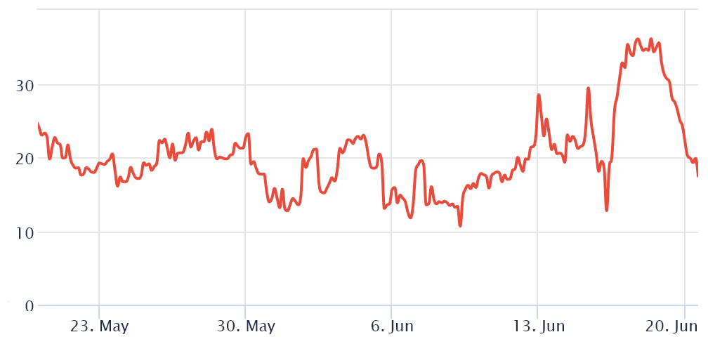 30 天的 delta skew在 6 月 18 日达到 36% 的峰值,这是有史以来的最高记录,也是极度看跌市场的典型表现。显然,自 17,580 美元触底以来,比特币价格上涨了 18%,这足以让衍生品交易员恢复一些信心。虽然 25% 的skew指标仍然不利于反映下行风险,但至少它不再处于反映极端避险情绪的水平。