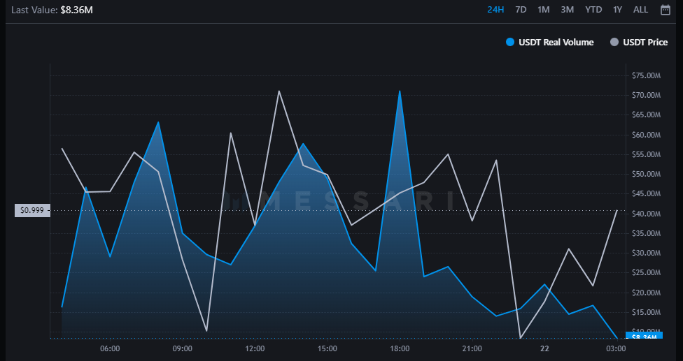 以太坊上USDT的24小时实际交易量:Messari
