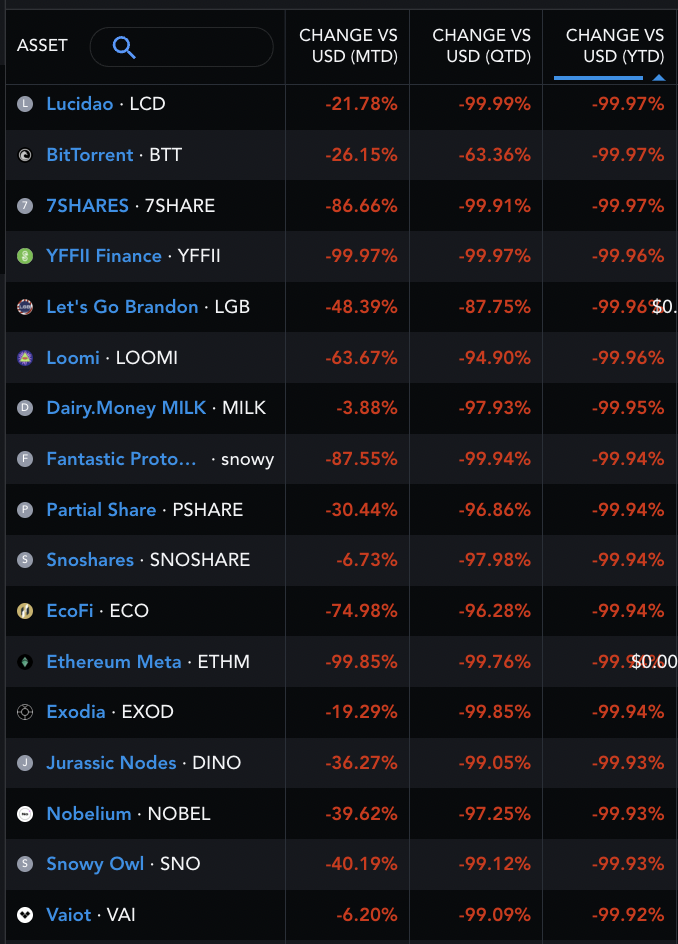 2022年已经面临近100%损失的山寨币 来源:Messari