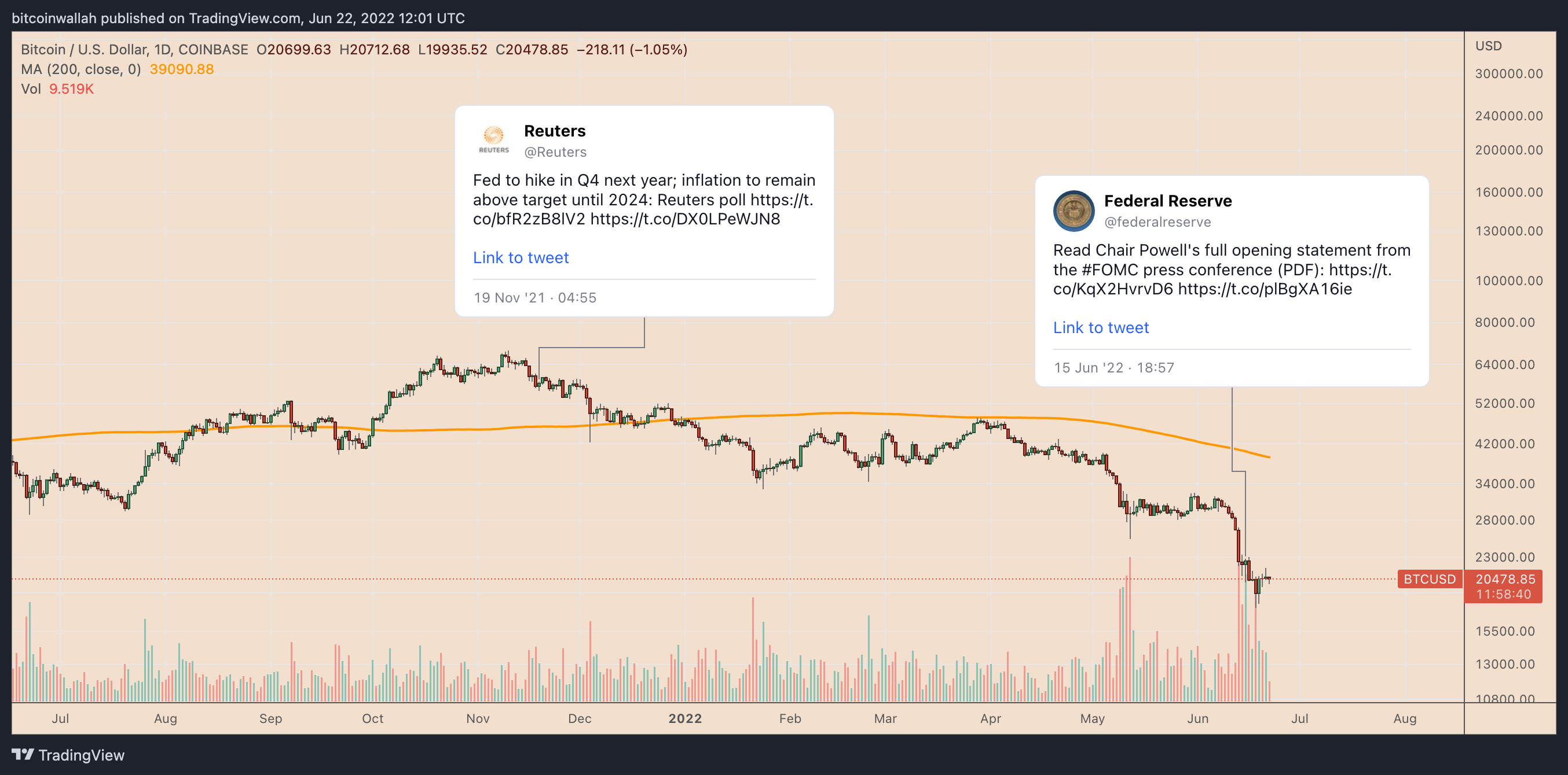 比特币的崩盘出现在通货膨胀加剧以及全球央行对其采取鹰派应对措施的时期。美联储为了抑制5月份达到8.4%的通货膨胀,于6月15日将基准利率上调了75个基点(bps)。