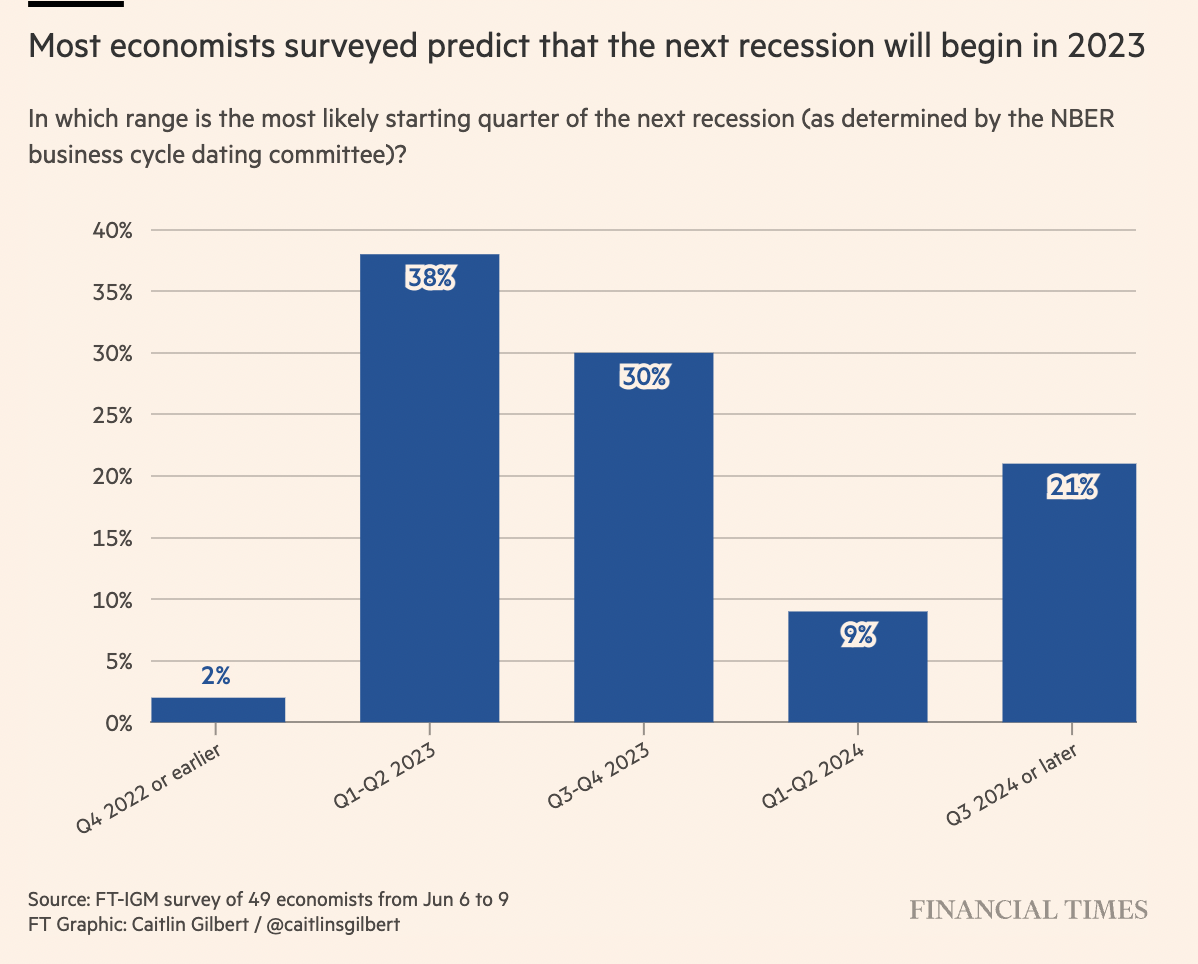 值得注意的是,约38%的人预计衰退将在2023年上半年开始,而30%的人预计衰退将在第三季度至第四季度期间开始。此外,彭博社5月份进行的另一项调查显示,明年出现衰退的可能性为30%。