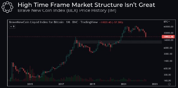 加密货币研究公司 Delphi Digital 触及了支持跌至 10,000 美元范围可能性的进一步证据,该公司发布了以下图表,指出“从高时间框架市场结构的角度来看,我们必须关注的下一个地方是1万美元- 1.2万美元。”