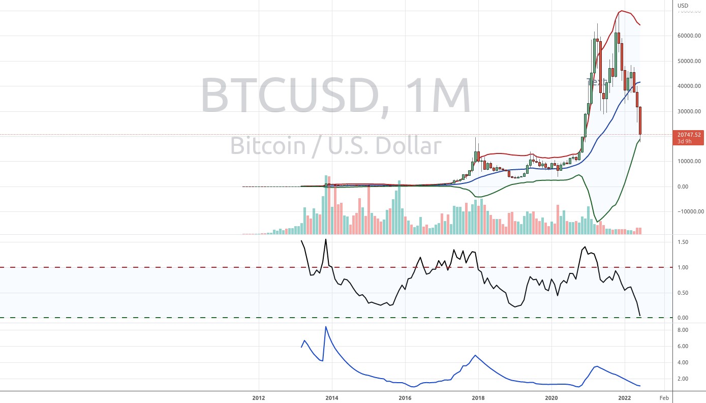 “月线图上描绘 BTCUSD 的完美双 (M 型) 顶部通过布林带和 %b 的确认。目前还没有迹象,但在这里筑底是一个合乎逻辑的选择。”