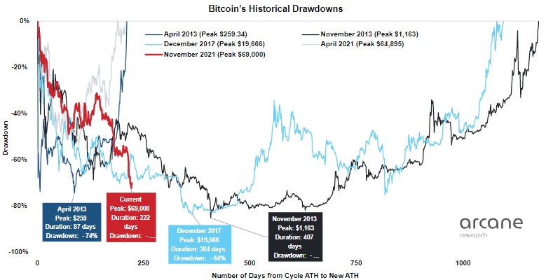 根据 Arcane Research 最近的一份报告,目前的回撤已经持续了 229 天,迄今为止最大回撤为 73%。